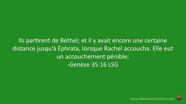 Ils partirent de Béthel; et il y avait encore une certaine distance jusqu'à Éphrata, lorsque Rachel accoucha. Elle eut un accouchement pénible; -Genèse 35:16 LSG