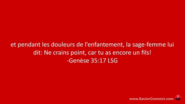 et pendant les douleurs de l'enfantement, la sage-femme lui dit: Ne crains point, car tu as encore un fils! -Genèse 35:17 LSG