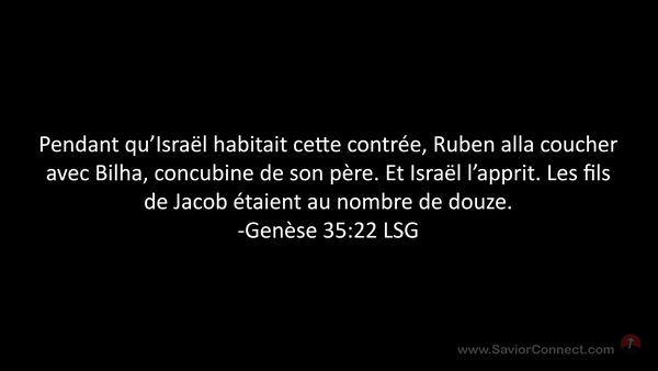 Pendant qu'Israël habitait cette contrée, Ruben alla coucher avec Bilha, concubine de son père. Et Israël l'apprit. Les fils de Jacob étaient au nombre de douze. -Genèse 35:22 LSG