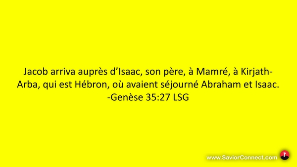 Jacob arriva auprès d'Isaac, son père, à Mamré, à Kirjath-Arba, qui est Hébron, où avaient séjourné Abraham et Isaac. -Genèse 35:27 LSG