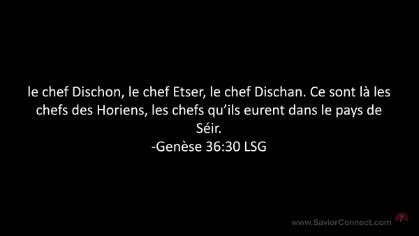 le chef Dischon, le chef Etser, le chef Dischan. Ce sont là les chefs des Horiens, les chefs qu'ils eurent dans le pays de Séir. -Genèse 36:30 LSG
