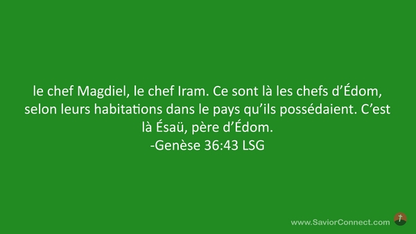 le chef Magdiel, le chef Iram. Ce sont là les chefs d'Édom, selon leurs habitations dans le pays qu'ils possédaient. C'est là Ésaü, père d'Édom. -Genèse 36:43 LSG