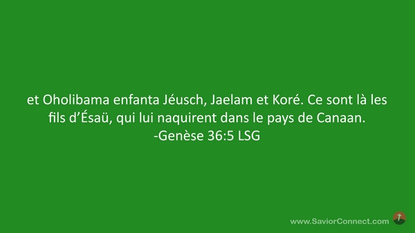 et Oholibama enfanta Jéusch, Jaelam et Koré. Ce sont là les fils d'Ésaü, qui lui naquirent dans le pays de Canaan. -Genèse 36:5 LSG