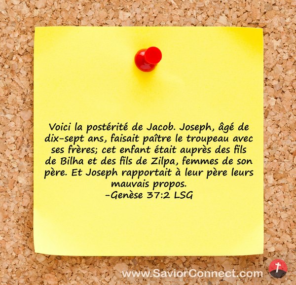 Voici la postérité de Jacob. Joseph, âgé de dix-sept ans, faisait paître le troupeau avec ses frères; cet enfant était auprès des fils de Bilha et des fils de Zilpa, femmes de son père. Et Joseph rapportait à leur père leurs mauvais propos. -Genèse 37:2 LSG