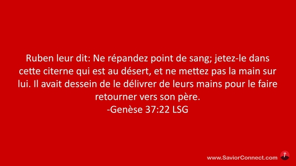 Ruben leur dit: Ne répandez point de sang; jetez-le dans cette citerne qui est au désert, et ne mettez pas la main sur lui. Il avait dessein de le délivrer de leurs mains pour le faire retourner vers son père. -Genèse 37:22 LSG
