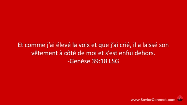 Et comme j'ai élevé la voix et que j'ai crié, il a laissé son vêtement à côté de moi et s'est enfui dehors. -Genèse 39:18 LSG