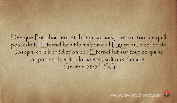 Dès que Potiphar l'eut établi sur sa maison et sur tout ce qu'il possédait, l'Éternel bénit la maison de l'Égyptien, à cause de Joseph; et la bénédiction de l'Éternel fut sur tout ce qui lui appartenait, soit à la maison, soit aux champs. -Genèse 39:5 LSG