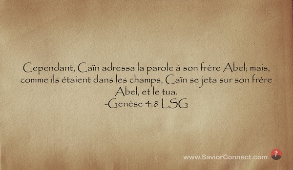 Cependant, Caïn adressa la parole à son frère Abel; mais, comme ils étaient dans les champs, Caïn se jeta sur son frère Abel, et le tua. -Genèse 4:8 LSG