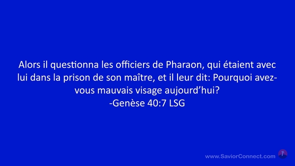 Alors il questionna les officiers de Pharaon, qui étaient avec lui dans la prison de son maître, et il leur dit: Pourquoi avez-vous mauvais visage aujourd'hui? -Genèse 40:7 LSG