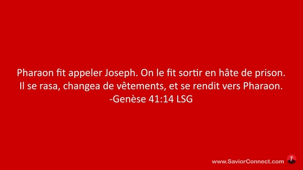 Pharaon fit appeler Joseph. On le fit sortir en hâte de prison. Il se rasa, changea de vêtements, et se rendit vers Pharaon. -Genèse 41:14 LSG