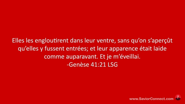 Elles les engloutirent dans leur ventre, sans qu'on s'aperçût qu'elles y fussent entrées; et leur apparence était laide comme auparavant. Et je m'éveillai. -Genèse 41:21 LSG