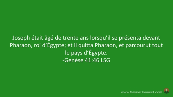 Joseph était âgé de trente ans lorsqu'il se présenta devant Pharaon, roi d'Égypte; et il quitta Pharaon, et parcourut tout le pays d'Égypte. -Genèse 41:46 LSG