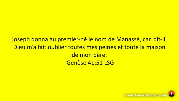 Joseph donna au premier-né le nom de Manassé, car, dit-il, Dieu m'a fait oublier toutes mes peines et toute la maison de mon père. -Genèse 41:51 LSG