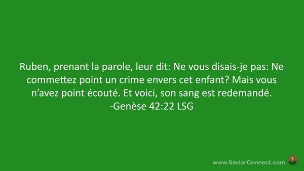 Ruben, prenant la parole, leur dit: Ne vous disais-je pas: Ne commettez point un crime envers cet enfant? Mais vous n'avez point écouté. Et voici, son sang est redemandé. -Genèse 42:22 LSG