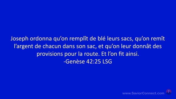 Joseph ordonna qu'on remplît de blé leurs sacs, qu'on remît l'argent de chacun dans son sac, et qu'on leur donnât des provisions pour la route. Et l'on fit ainsi. -Genèse 42:25 LSG