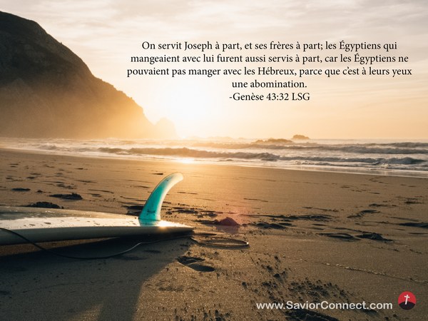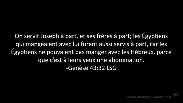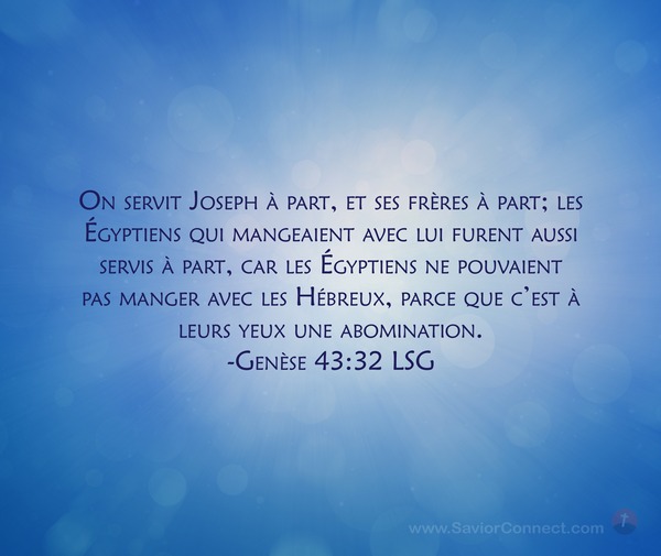 On servit Joseph à part, et ses frères à part; les Égyptiens qui mangeaient avec lui furent aussi servis à part, car les Égyptiens ne pouvaient pas manger avec les Hébreux, parce que c'est à leurs yeux une abomination. -Genèse 43:32 LSG