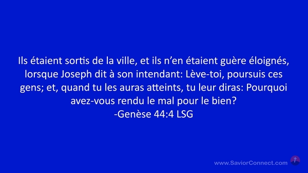 Ils étaient sortis de la ville, et ils n'en étaient guère éloignés, lorsque Joseph dit à son intendant: Lève-toi, poursuis ces gens; et, quand tu les auras atteints, tu leur diras: Pourquoi avez-vous rendu le mal pour le bien? -Genèse 44:4 LSG