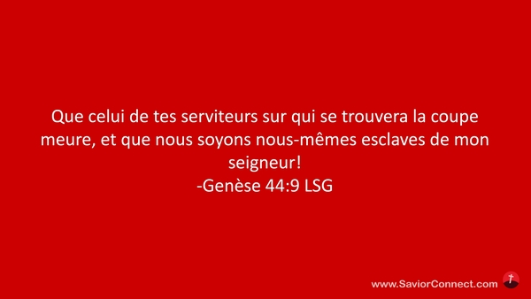 Que celui de tes serviteurs sur qui se trouvera la coupe meure, et que nous soyons nous-mêmes esclaves de mon seigneur! -Genèse 44:9 LSG