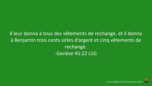 Il leur donna à tous des vêtements de rechange, et il donna à Benjamin trois cents sicles d'argent et cinq vêtements de rechange. -Genèse 45:22 LSG