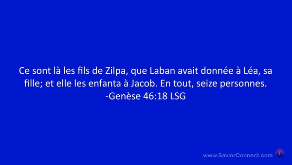 Ce sont là les fils de Zilpa, que Laban avait donnée à Léa, sa fille; et elle les enfanta à Jacob. En tout, seize personnes. -Genèse 46:18 LSG