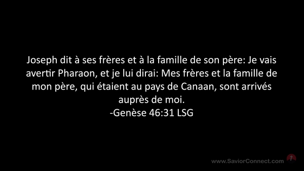 Joseph dit à ses frères et à la famille de son père: Je vais avertir Pharaon, et je lui dirai: Mes frères et la famille de mon père, qui étaient au pays de Canaan, sont arrivés auprès de moi. -Genèse 46:31 LSG