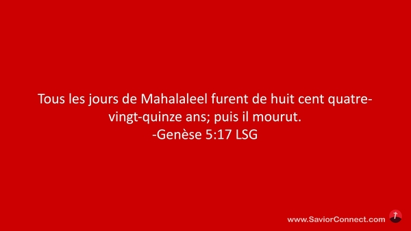 Tous les jours de Mahalaleel furent de huit cent quatre-vingt-quinze ans; puis il mourut. -Genèse 5:17 LSG