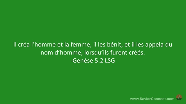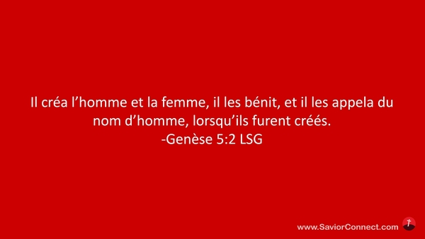 Il créa l'homme et la femme, il les bénit, et il les appela du nom d'homme, lorsqu'ils furent créés. -Genèse 5:2 LSG