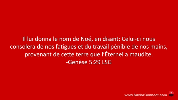 Il lui donna le nom de Noé, en disant: Celui-ci nous consolera de nos fatigues et du travail pénible de nos mains, provenant de cette terre que l'Éternel a maudite. -Genèse 5:29 LSG