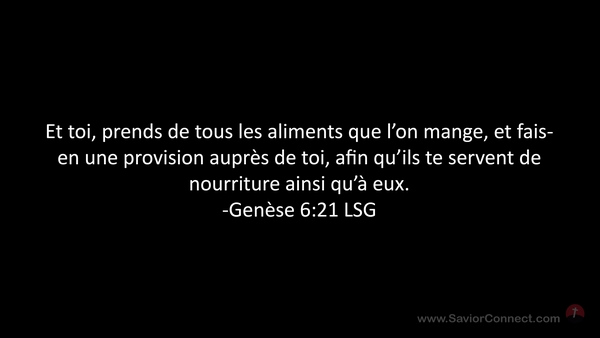 Et toi, prends de tous les aliments que l'on mange, et fais-en une provision auprès de toi, afin qu'ils te servent de nourriture ainsi qu'à eux. -Genèse 6:21 LSG