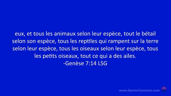 eux, et tous les animaux selon leur espèce, tout le bétail selon son espèce, tous les reptiles qui rampent sur la terre selon leur espèce, tous les oiseaux selon leur espèce, tous les petits oiseaux, tout ce qui a des ailes. -Genèse 7:14 LSG