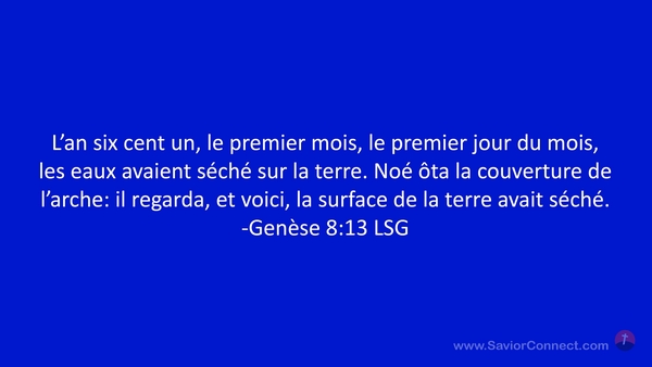 L'an six cent un, le premier mois, le premier jour du mois, les eaux avaient séché sur la terre. Noé ôta la couverture de l'arche: il regarda, et voici, la surface de la terre avait séché. -Genèse 8:13 LSG