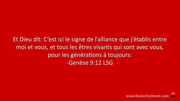 Et Dieu dit: C'est ici le signe de l'alliance que j'établis entre moi et vous, et tous les êtres vivants qui sont avec vous, pour les générations à toujours: -Genèse 9:12 LSG