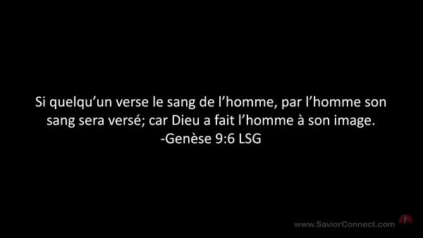 Si quelqu'un verse le sang de l'homme, par l'homme son sang sera versé; car Dieu a fait l'homme à son image. -Genèse 9:6 LSG
