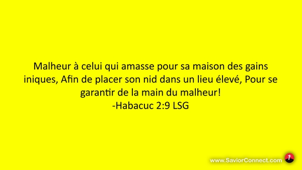 Malheur à celui qui amasse pour sa maison des gains iniques, Afin de placer son nid dans un lieu élevé, Pour se garantir de la main du malheur! -Habacuc 2:9 LSG
