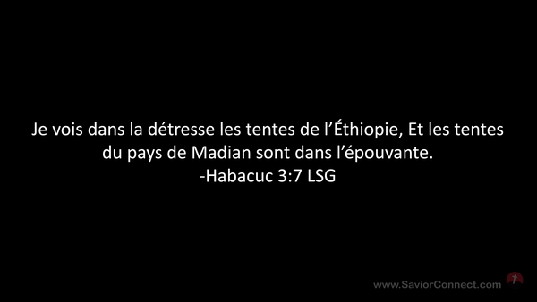 Je vois dans la détresse les tentes de l'Éthiopie, Et les tentes du pays de Madian sont dans l'épouvante. -Habacuc 3:7 LSG