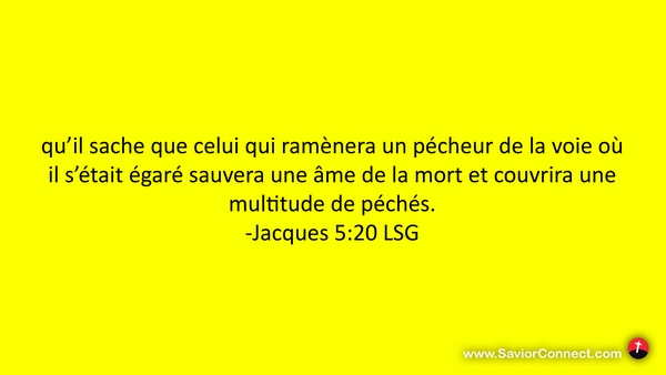 qu'il sache que celui qui ramènera un pécheur de la voie où il s'était égaré sauvera une âme de la mort et couvrira une multitude de péchés. -Jacques 5:20 LSG