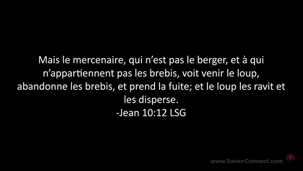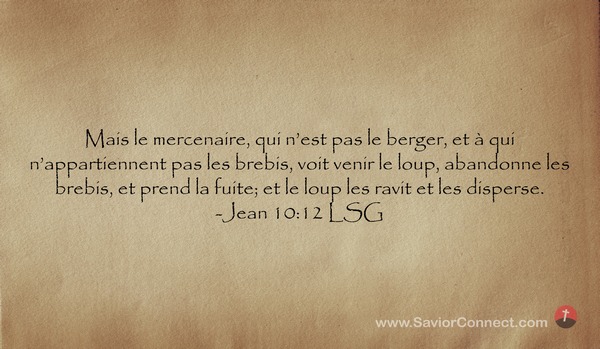 Mais le mercenaire, qui n'est pas le berger, et à qui n'appartiennent pas les brebis, voit venir le loup, abandonne les brebis, et prend la fuite; et le loup les ravit et les disperse. -Jean 10:12 LSG