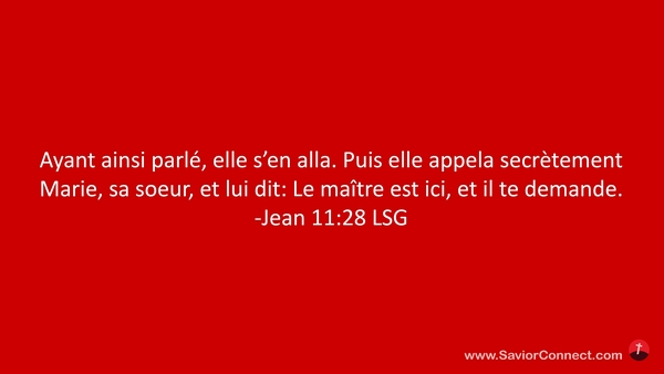 Ayant ainsi parlé, elle s'en alla. Puis elle appela secrètement Marie, sa soeur, et lui dit: Le maître est ici, et il te demande. -Jean 11:28 LSG