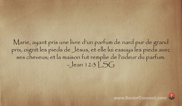 Marie, ayant pris une livre d'un parfum de nard pur de grand prix, oignit les pieds de Jésus, et elle lui essuya les pieds avec ses cheveux; et la maison fut remplie de l'odeur du parfum. -Jean 12:3 LSG