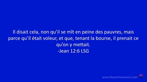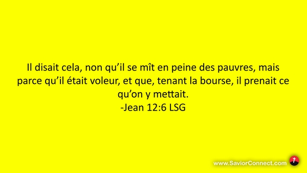 Il disait cela, non qu'il se mît en peine des pauvres, mais parce qu'il était voleur, et que, tenant la bourse, il prenait ce qu'on y mettait. -Jean 12:6 LSG