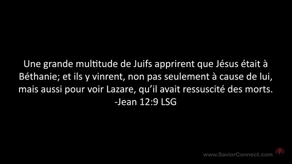 Une grande multitude de Juifs apprirent que Jésus était à Béthanie; et ils y vinrent, non pas seulement à cause de lui, mais aussi pour voir Lazare, qu'il avait ressuscité des morts. -Jean 12:9 LSG