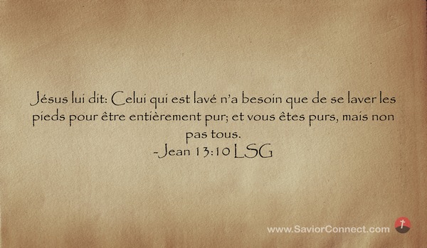 Jésus lui dit: Celui qui est lavé n'a besoin que de se laver les pieds pour être entièrement pur; et vous êtes purs, mais non pas tous. -Jean 13:10 LSG