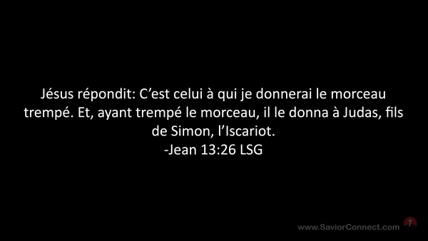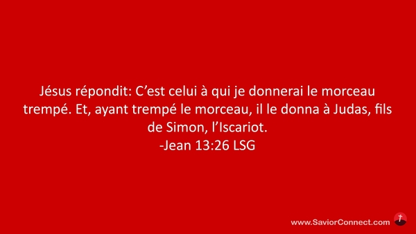 Jésus répondit: C'est celui à qui je donnerai le morceau trempé. Et, ayant trempé le morceau, il le donna à Judas, fils de Simon, l'Iscariot. -Jean 13:26 LSG