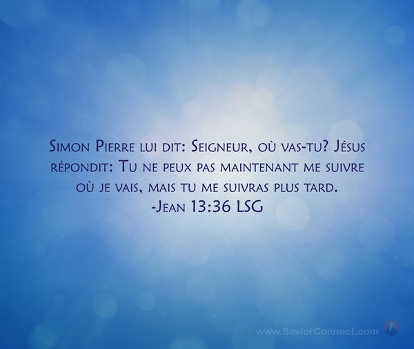 Simon Pierre lui dit: Seigneur, où vas-tu? Jésus répondit: Tu ne peux pas maintenant me suivre où je vais, mais tu me suivras plus tard. -Jean 13:36 LSG