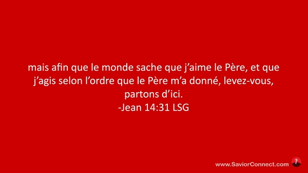 mais afin que le monde sache que j'aime le Père, et que j'agis selon l'ordre que le Père m'a donné, levez-vous, partons d'ici. -Jean 14:31 LSG
