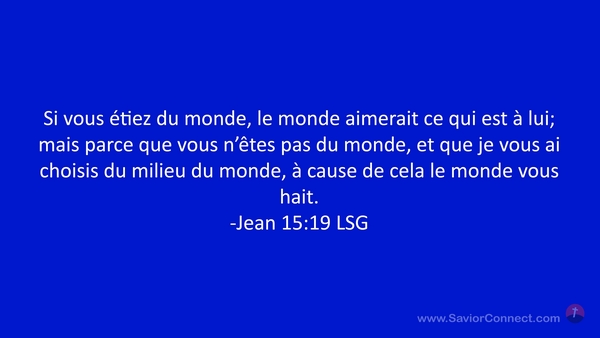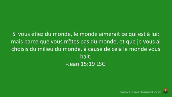 Si vous étiez du monde, le monde aimerait ce qui est à lui; mais parce que vous n'êtes pas du monde, et que je vous ai choisis du milieu du monde, à cause de cela le monde vous hait. -Jean 15:19 LSG