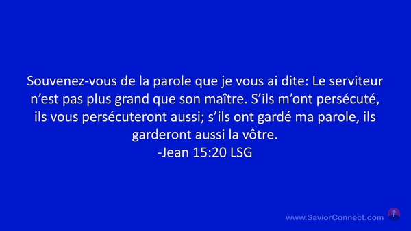 Souvenez-vous de la parole que je vous ai dite: Le serviteur n'est pas plus grand que son maître. S'ils m'ont persécuté, ils vous persécuteront aussi; s'ils ont gardé ma parole, ils garderont aussi la vôtre. -Jean 15:20 LSG