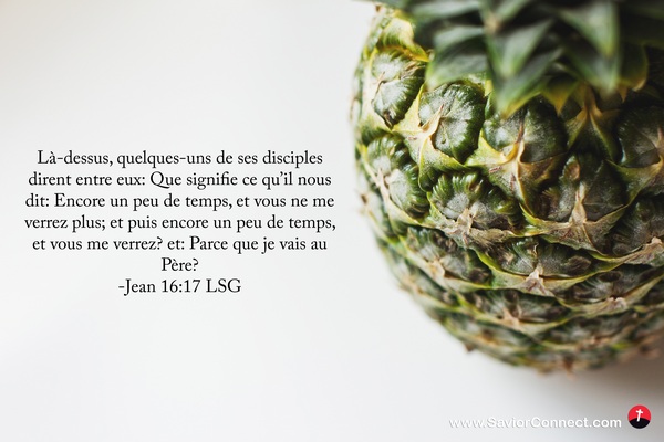 Là-dessus, quelques-uns de ses disciples dirent entre eux: Que signifie ce qu'il nous dit: Encore un peu de temps, et vous ne me verrez plus; et puis encore un peu de temps, et vous me verrez? et: Parce que je vais au Père? -Jean 16:17 LSG