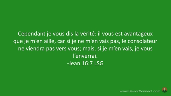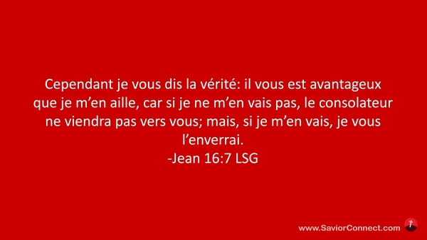 Cependant je vous dis la vérité: il vous est avantageux que je m'en aille, car si je ne m'en vais pas, le consolateur ne viendra pas vers vous; mais, si je m'en vais, je vous l'enverrai. -Jean 16:7 LSG