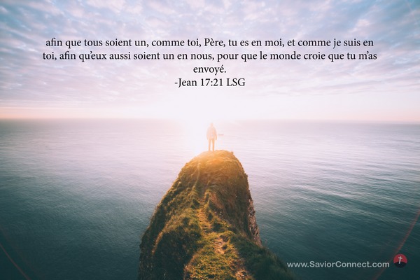 afin que tous soient un, comme toi, Père, tu es en moi, et comme je suis en toi, afin qu'eux aussi soient un en nous, pour que le monde croie que tu m'as envoyé. -Jean 17:21 LSG
